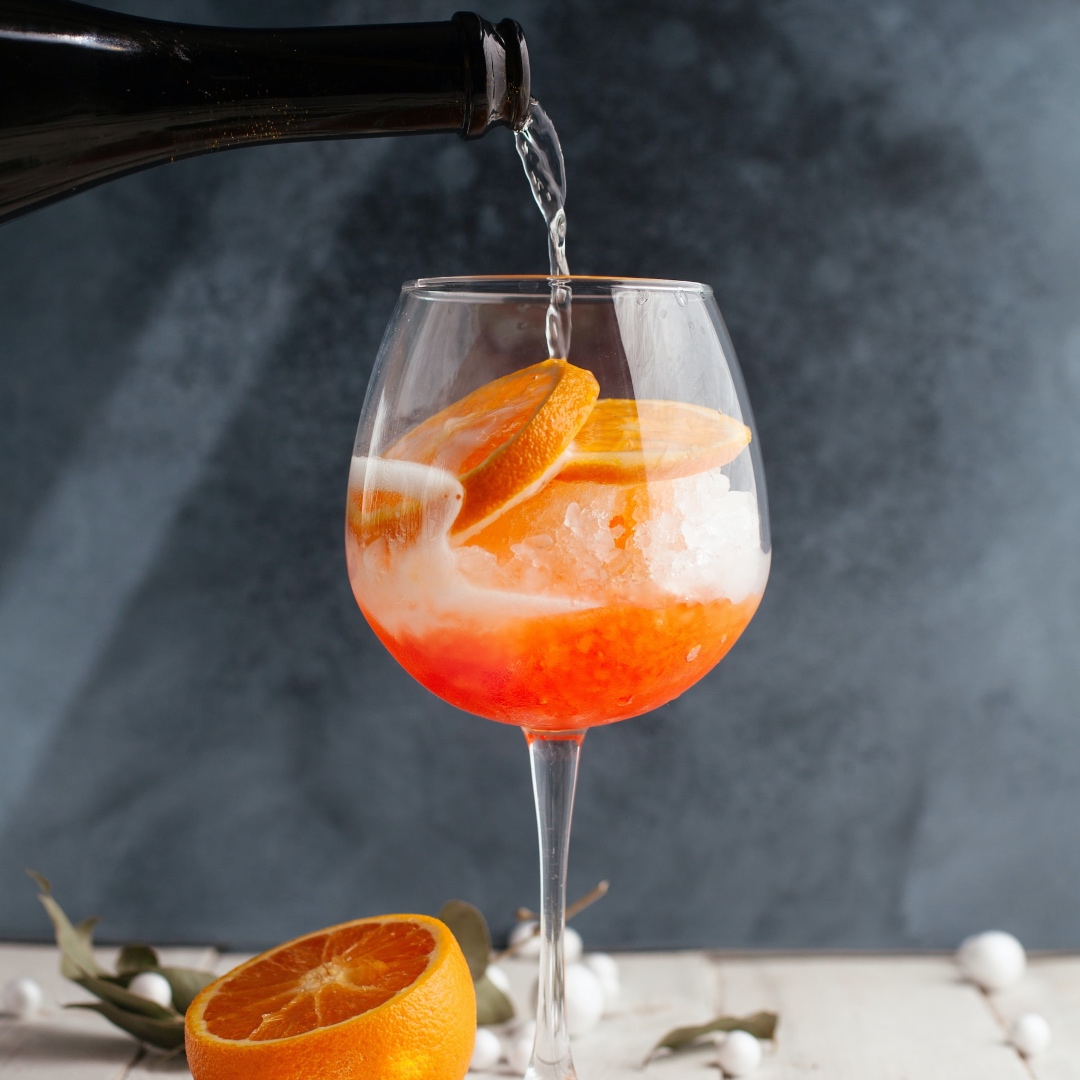 Vierte el Ramazzotti Rosato, seguido del prosecco y agua con gas.